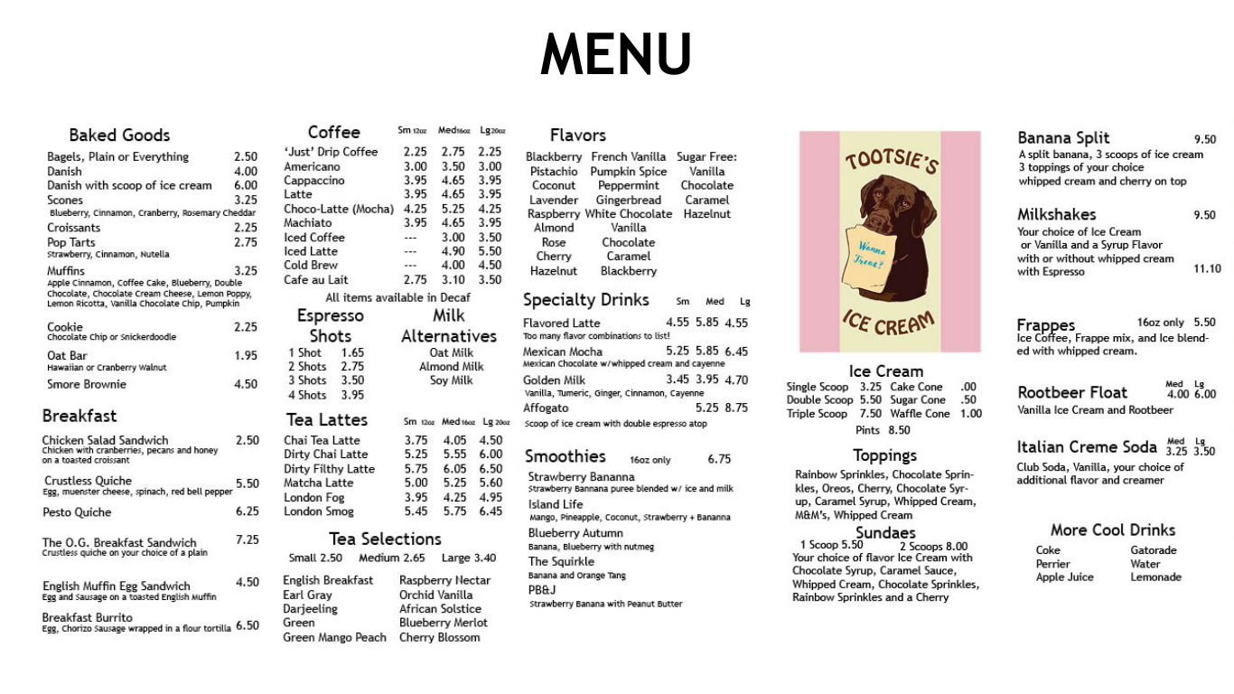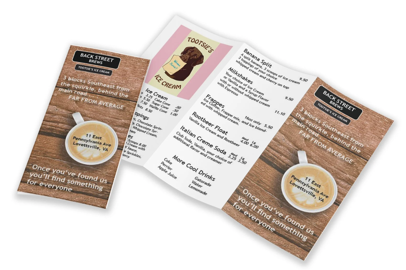 Set in an historic building, with limited space for menu display, tri-fold menus let customers peruse their options before approaching the counter to order. These can also be distributed to local hotels and AirBnBs.