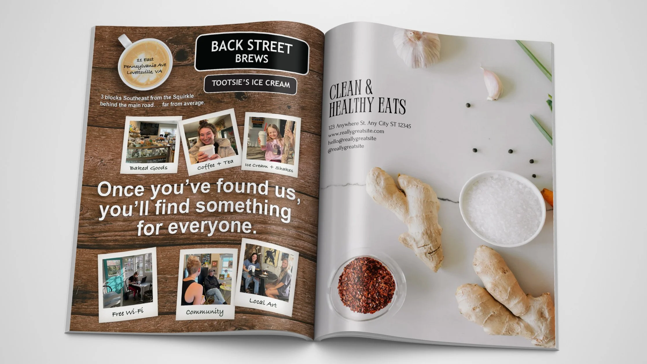 A full page ad in a local magazine communicates the extent of offerings the shop offers as well as hinting to the rustic esthetic of the space.